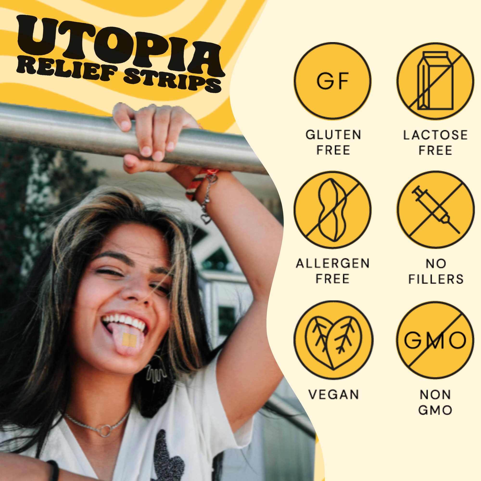 Utopia Relief Strips: Pre-Party (5 Count) are dissolvable oral strips designed to support your body before your first beverage. Each strip is packed with natural plant extracts that promote liver function, hydration, and recovery. By giving your body an excess of the essential vitamins and minerals that are lost when consuming alcohol ahead of time, you can enjoy your night out with a boost of support on your side. Just peel one strip, place it on your tongue until fully dissolved, and pour your favorite beverage to kick off your night the Utopia way.